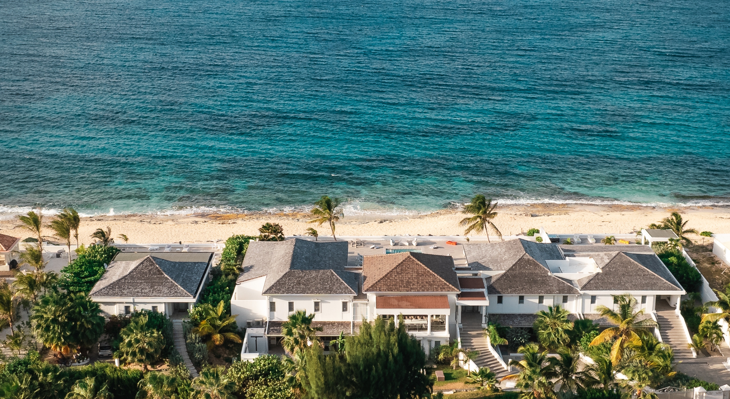 With the two neighboring sister villas, this newly reconstructed 5 BR beachfront property can