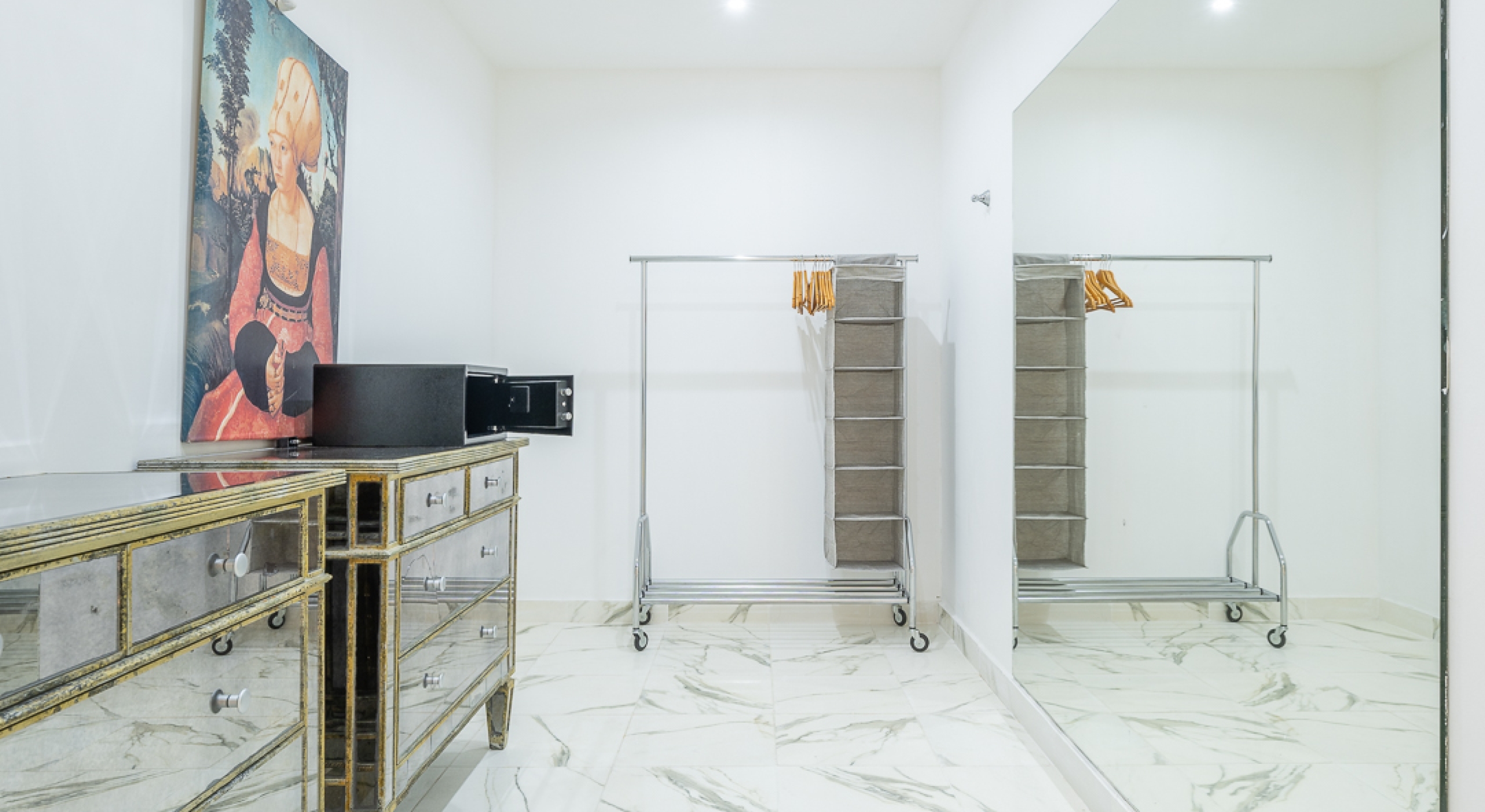 ceiling fan, TV, king-size bed (except 1 Queen), and walk-in closet.
